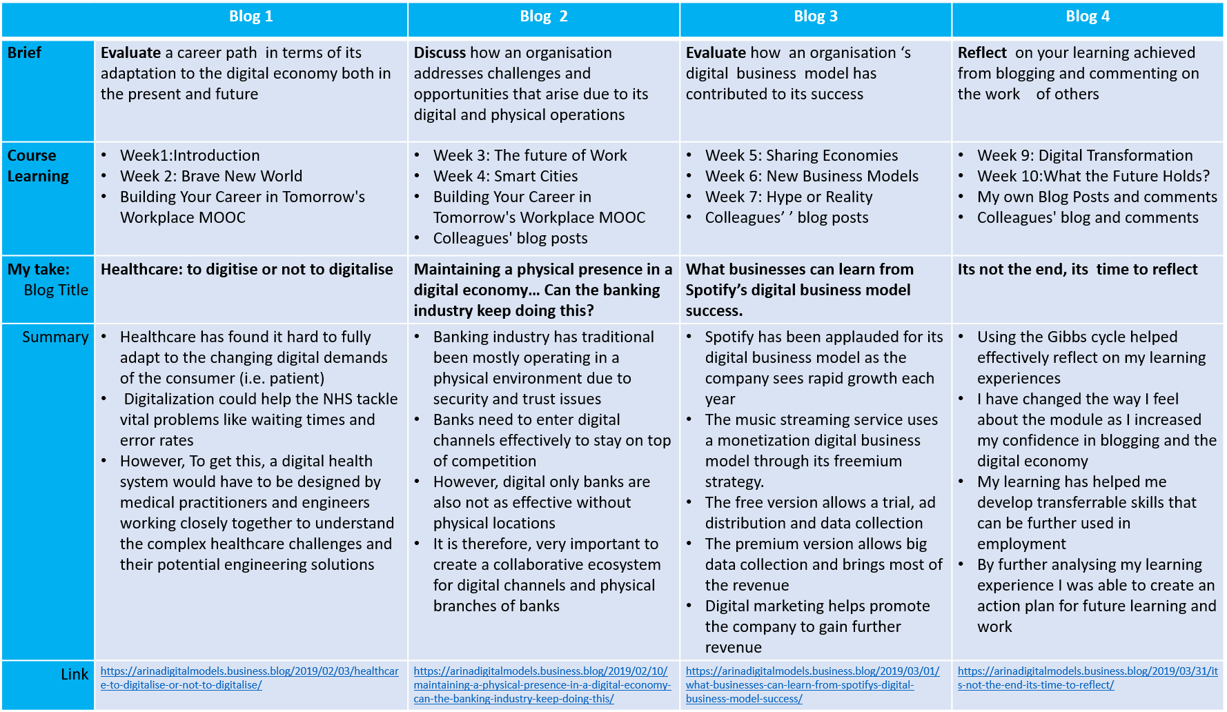Overall the analysis shown in Figure 6 and the Action Plan and Conclusion in Figure 7 demonstrate that my experience was a positive one with an exception of the learning environment provided the module. It was hard for me to change the way I learn in this short period of time and therefore I found it difficult at times to perform at my best. A well as this , becausei have never done blogs before it was hard for me to grasp this technical part at first. Due to my hard work and timely prioritisation I was able to perform well in the tasks. In addition, I enjoyed the content which encouraged me to comment and participate in the module. I have learned enough about the digital bussiness enviroment to have a solid foundation for further learning. The skills i have learnt will increase my employability in the digital world.