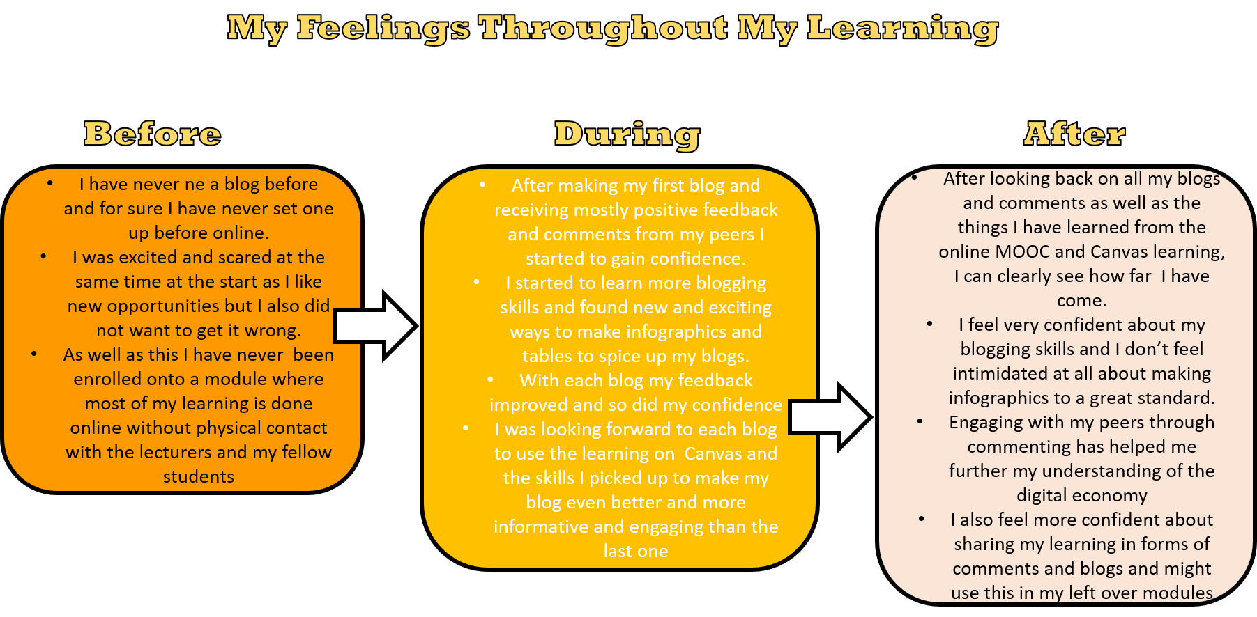 Below (Figure 4) you can see my feelings before, during and after the module. It is important to reflect on how I feel at these stages in the module as it correlates with my learning and improvement. The grades and values I have received at each stage closely link to how I felt about the module at various times. Mainly the reflection shows that I am way more confident about blogging and digital economy now than I was before.