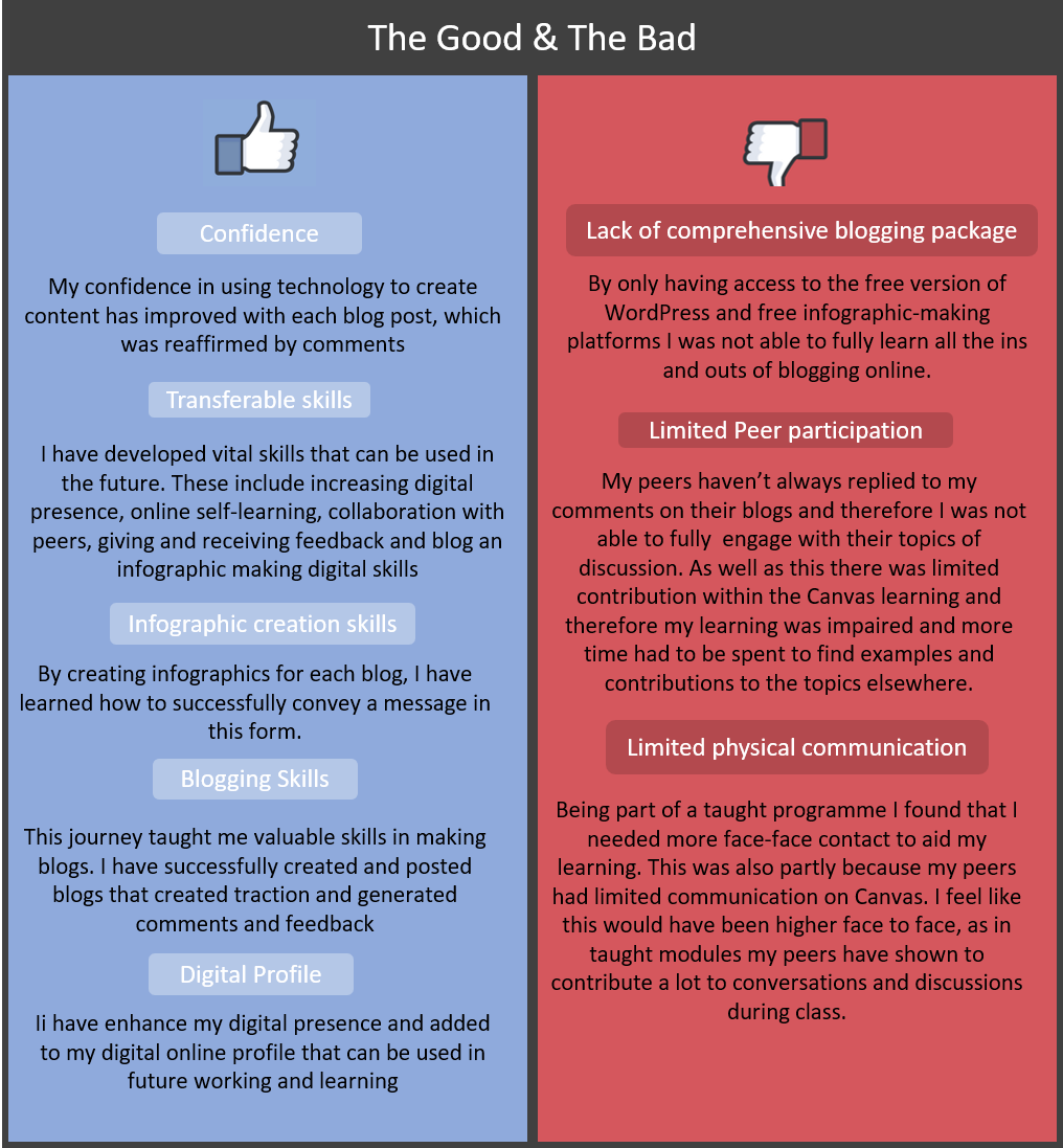It is important to remember my journey through this module. You can see this journey either on this blog or below in Figure 2 and 3. These figures show my learning journey as well as my contribution to the groups learning by commenting and adding my knowledge, research and views to other people’s work. This allows both me and the rest of the group to see different sides of an arguments as well as expanding our horizons further on certain topic throughout the module.